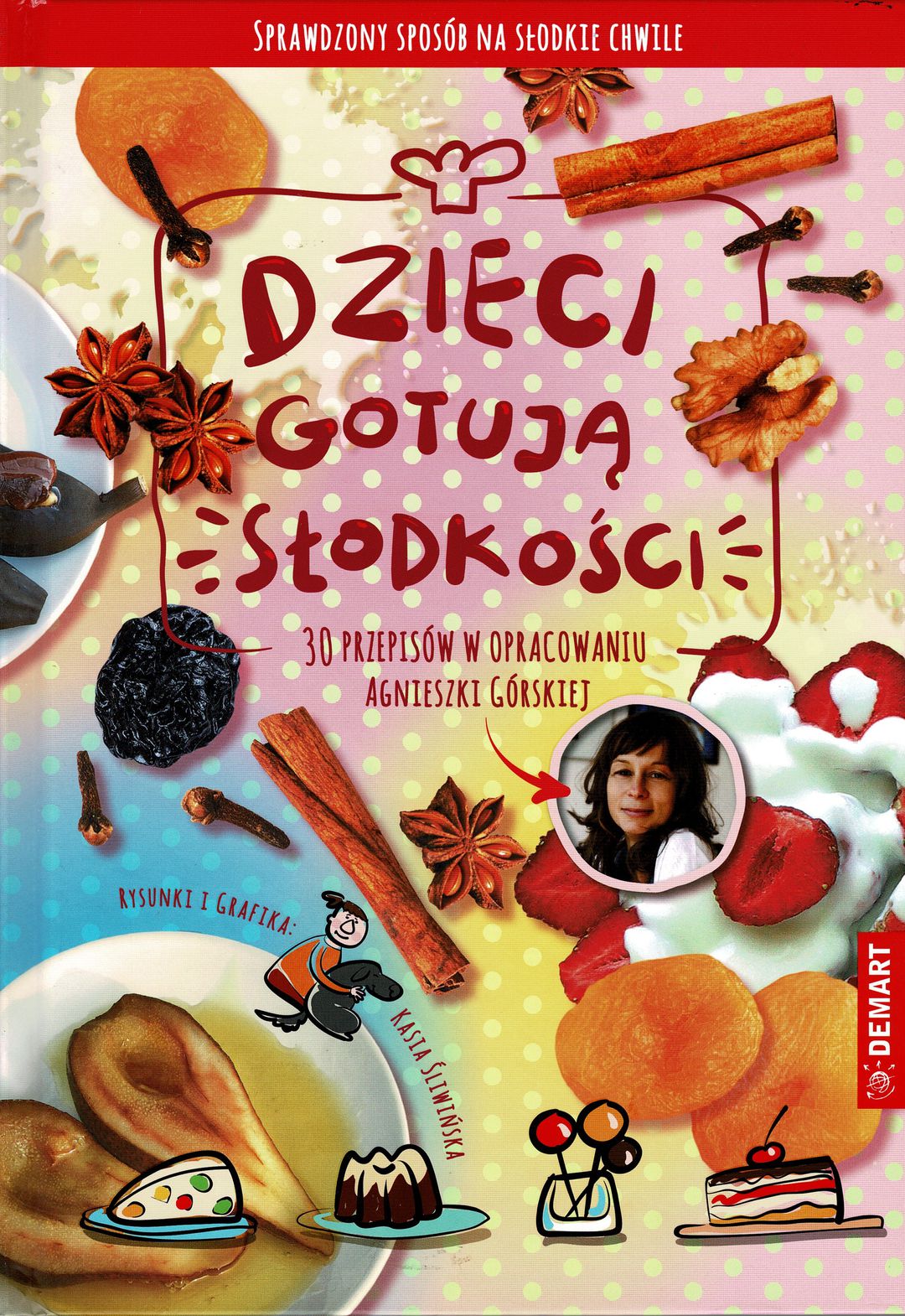 Dzieci gotują słodkości : 30 przepisów / w opracowaniu Agnieszki Górskiej ; rysunki i grafika: Kasia Śliwińska. - Warszawa : Demart, copyright 2022/2023. - 80, [2] strony : fotografie, ilustracje ; 30 cm.